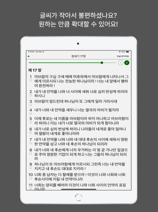 설치 후 별도의 설정 없이 바로 성경 말씀을 읽을 수 있으며, 사용자의 눈에 맞게 글자 크기와 밝기 등을 조절할 수 있습니다.
