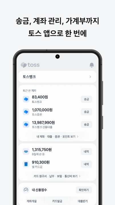모든 계좌, 카드, 소비 정보를 토스 앱에서 손쉽게 관리할 수 있습니다.