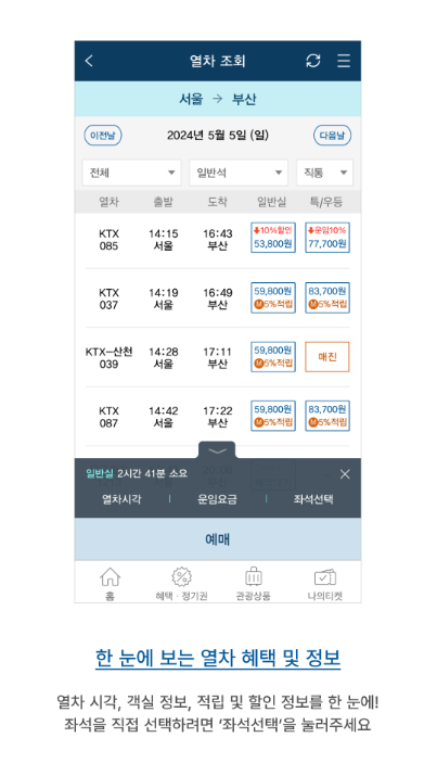 회원 전용의 다양한 혜택이 준비된 코레일 앱에서는 적립 혜택, 포인트 사용 등 멤버십 프로그램이 잘 구축되어 있습니다. 정기 이용자일수록 더 많은 혜택을 누릴 수 있는 구조로, 승차권 구매와 동시에 포인트 적립 가능합니다.
