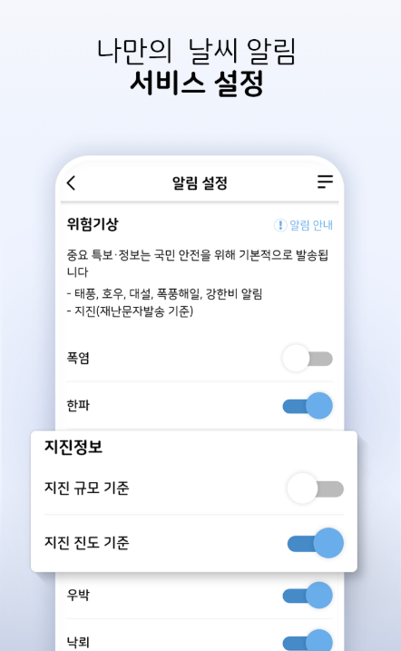 - 지진, 폭염, 한파 등의 알림 제공