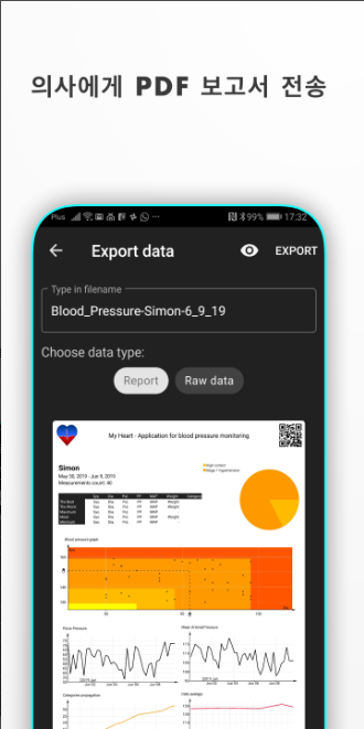 PDF로 만들어진 보고서는 혈압 수치를 시각화한 차트와 함께 제공되어 병원 진료 시 바로 제출이 가능합니다. 손쉬운 저장 및 전송 기능으로 의사와의 소통이 더욱 원활해집니다.
