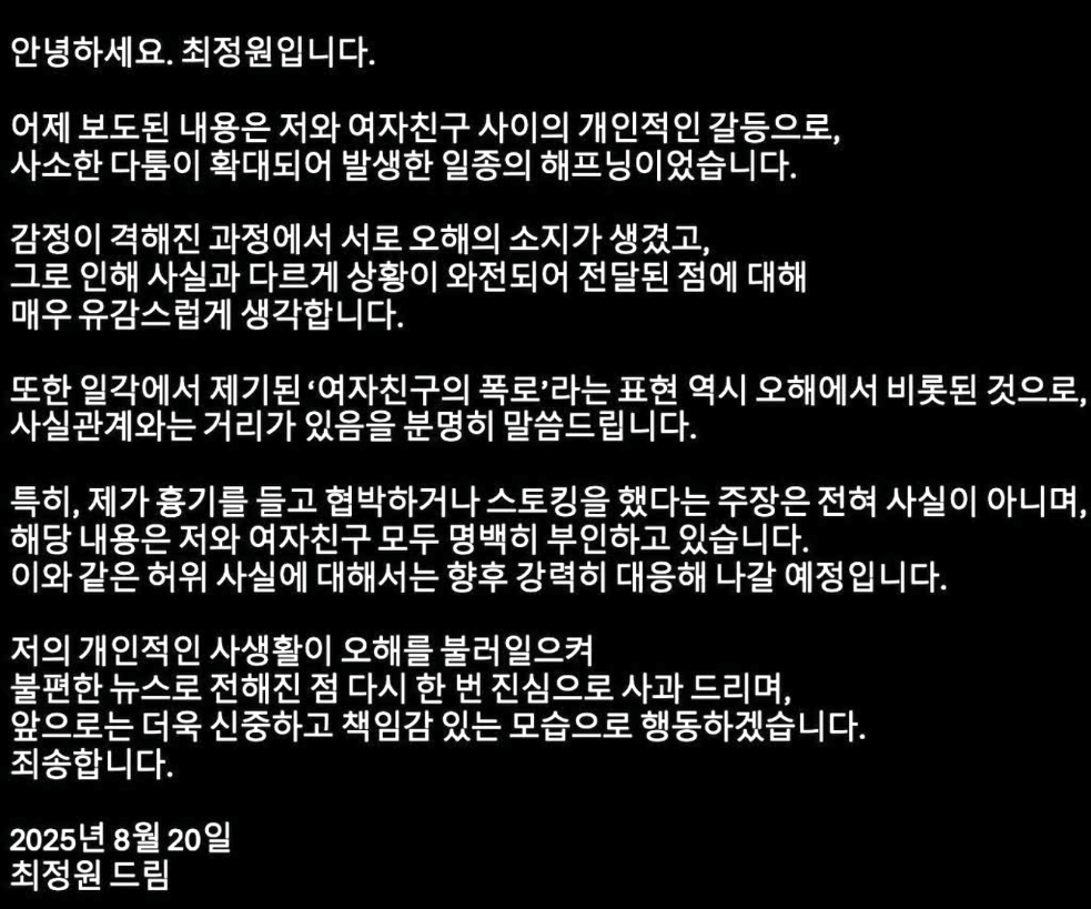 A. 최정원은 SNS를 통해 이번 사건은 연인 간 사소한 다툼이 와전된 것이라고 설명했습니다. 또한 흉기를 들고 협박하거나 스토킹을 했다는 주장은 명백히 사실이 아니라고 강조했으며, 이러한 허위 사실에 대해서는 강력하게 법적 대응을 하겠다고 밝혔습니다.
