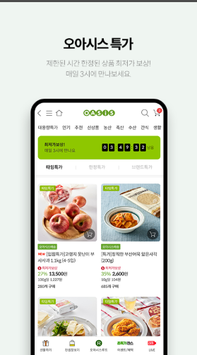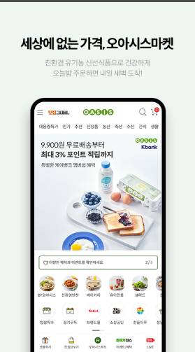 오아시스마켓 앱은 직관적인 인터페이스로 빠른 상품 탐색이 가능하다. 홈 화면에서 추천 상품과 기획전을 한눈에 확인할 수 있으며, 알림 기능을 통해 놓치기 쉬운 정보도 쉽게 관리할 수 있다. 사용자 중심의 설계로 장바구니 관리와 재구매 과정이 간편하다. 이러한 기능은 반복 구매 환경을 개선하여 쇼핑 시간을 단축시키고, 구매 피로도를 줄인다. 또한 베스트 상품과 테마별 추천 기능을 통해 선택의 폭을 넓혀, 다양한 식재료를 손쉽게 경험할 수 있도록 돕는다.