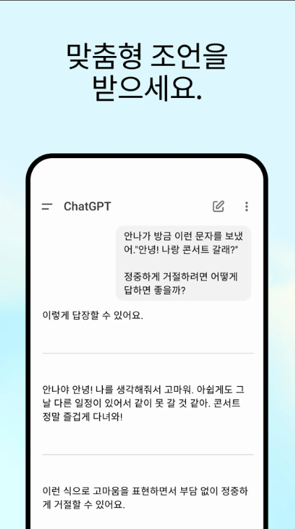 ChatGPT는 스마트폰과 PC에서 모두 설치하거나 사용할 수 있으며, 다양한 기능으로 일상과 업무에 모두 유용하게 활용됩니다. 언제 어디서나 인공지능의 힘을 활용하고자 한다면 지금 바로 설치해보는 것이 현명한 선택입니다.