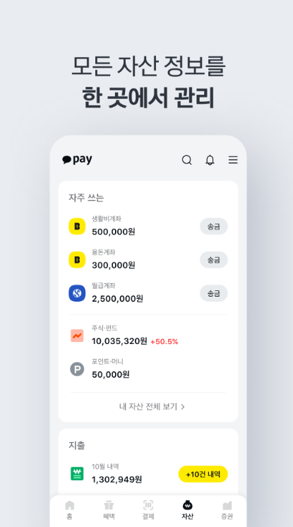 | 자산관리 | 계좌, 카드, 투자 통합관리 | 한눈에 자산 확인 가능 |
