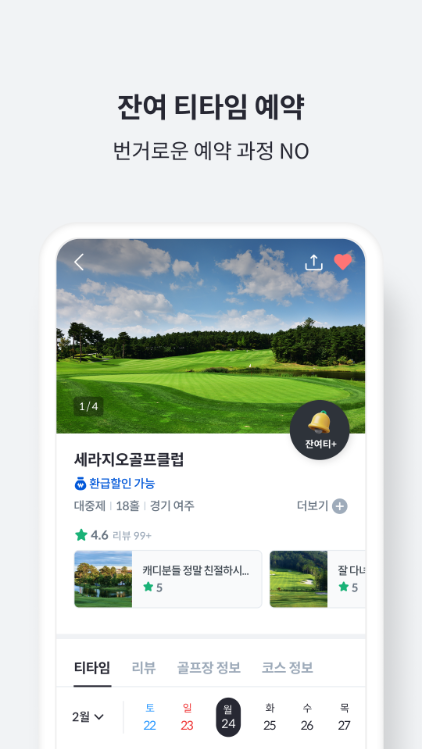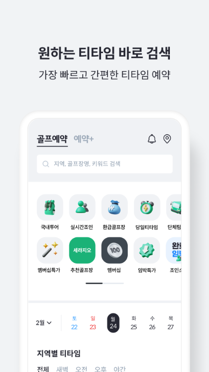 홈 화면 상단에 검색 기능이 배치되어 빠르게 티타임을 확인할 수 있습니다. 이전보다 더 간결하고 가독성 높은 레이아웃 덕분에 원하는 골프장을 손쉽게 찾을 수 있으며, 티타임 조회 속도 또한 매우 빠릅니다. 간편한 검색과 실시간 결과 제공이 핵심 장점입니다.