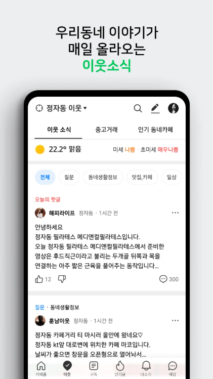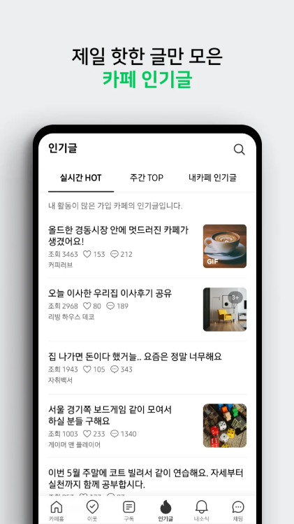 네이버카페 앱을 설치하면 실시간 인기글, 지역 소식, 관심 키워드 글을 한 번에 확인할 수 있으며 다양한 커뮤니티 활동이 훨씬 쉬워집니다.