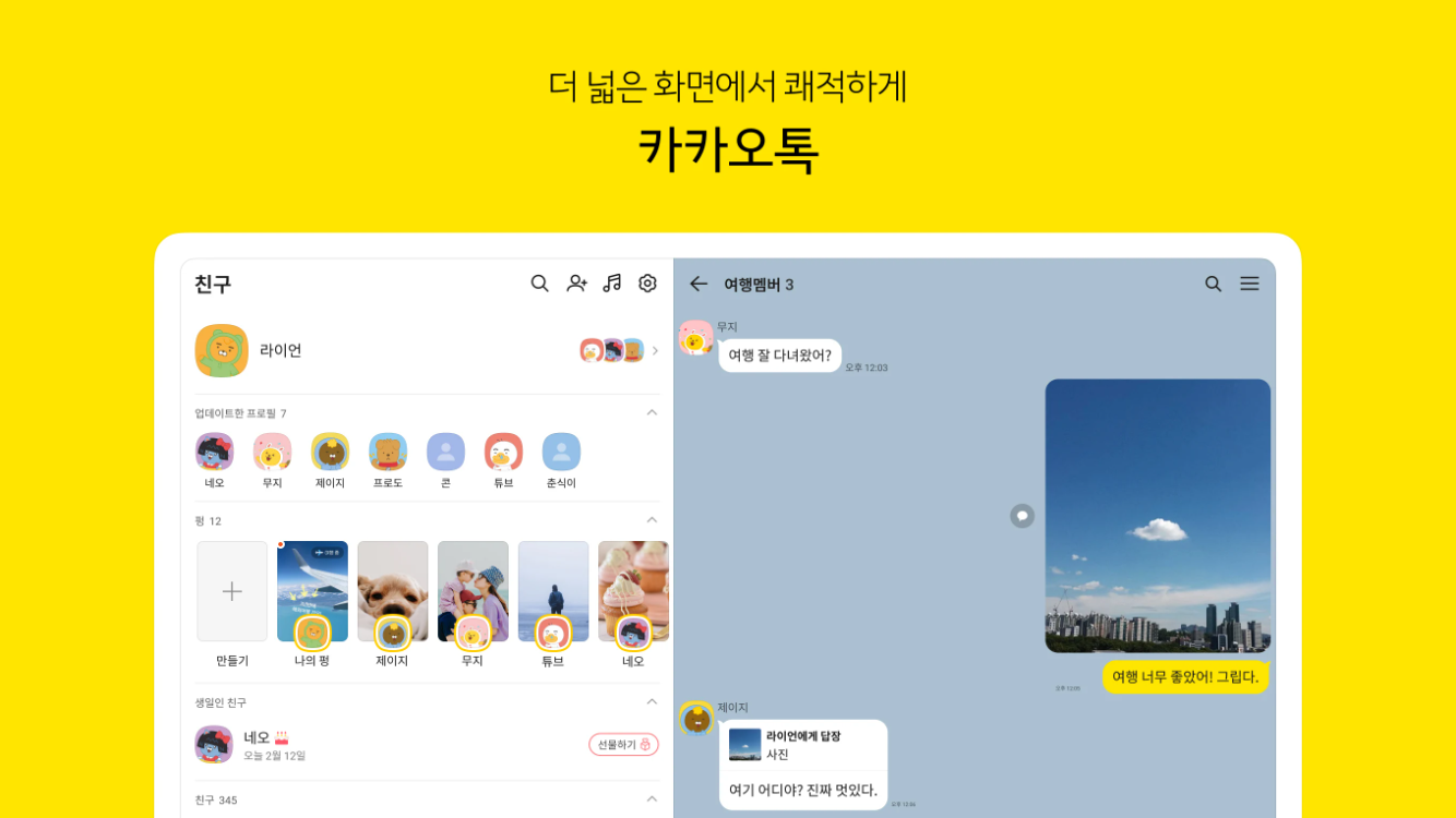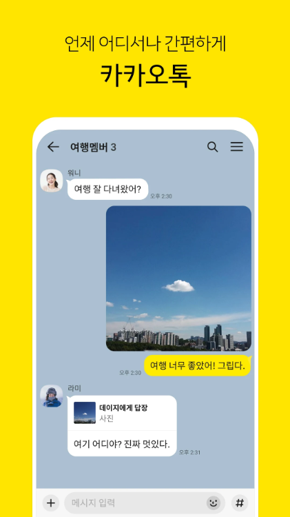 카카오톡은 사진, 영상, 메시지를 실시간으로 주고받을 수 있는 대표적인 모바일 메신저입니다. 안드로이드폰과 아이폰 모두에서 설치 가능하며, 전 세계 사용자와 간편하게 연결됩니다.